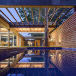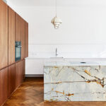 As one traverses through the building’s eight floors, natural light floods the interiors through an array of windows, casting vivid shadows and illuminating the rich color palette curated by Tuckey Design Studio. The journey upward is punctuated by a transition in texture and tonality, with new timber panelling guiding the ascent and culminating in spacious landings that seamlessly integrate bathrooms and kitchenettes on each level.