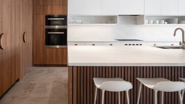 As one traverses through the building’s eight floors, natural light floods the interiors through an array of windows, casting vivid shadows and illuminating the rich color palette curated by Tuckey Design Studio. The journey upward is punctuated by a transition in texture and tonality, with new timber panelling guiding the ascent and culminating in spacious landings that seamlessly integrate bathrooms and kitchenettes on each level.