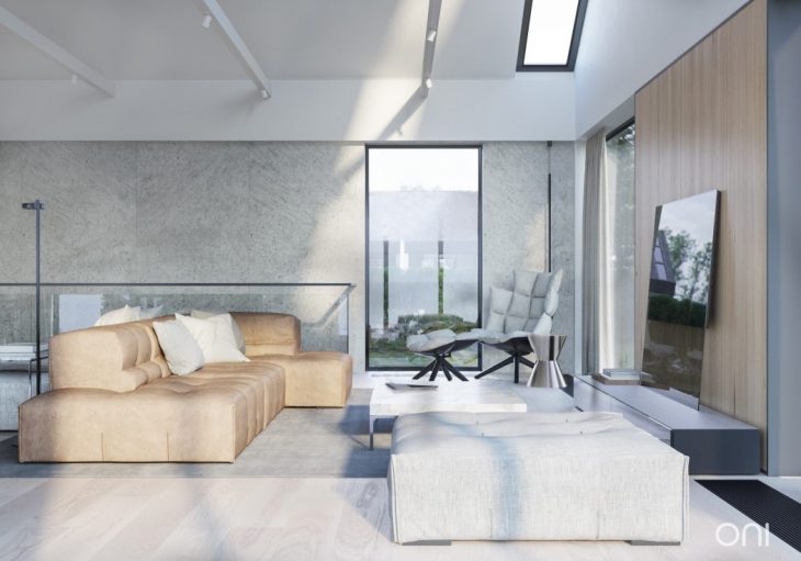 At the request of the customer, we designed an interior for a two-story house with impressive views. The main requirement was to create a modern and “air” environment for living. Our idea was to simplify and clean the spaces with emphasis on modern furniture and decoration materials. In the interior we proceeded from the concept of urbanism, which was transmitted through a gable roof. Under it there is a spacious and bright living room, a kitchen-dining room and an entrance hall. The interior of the living room creates a feeling of softness due to one of the main advantages of the house architecture – huge panoramic windows and an opening view on the surrounding territory.