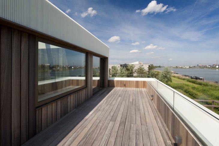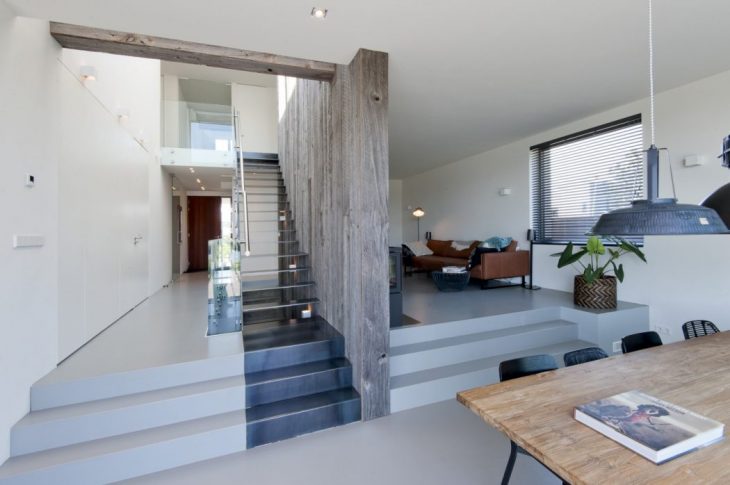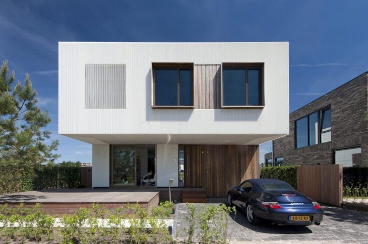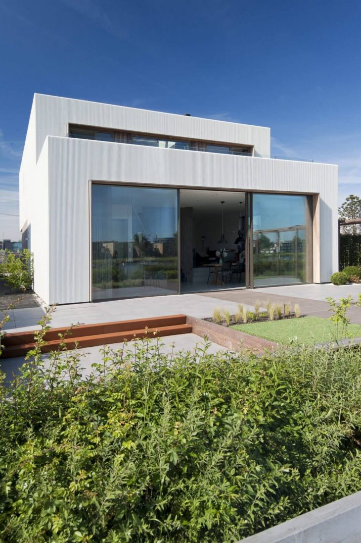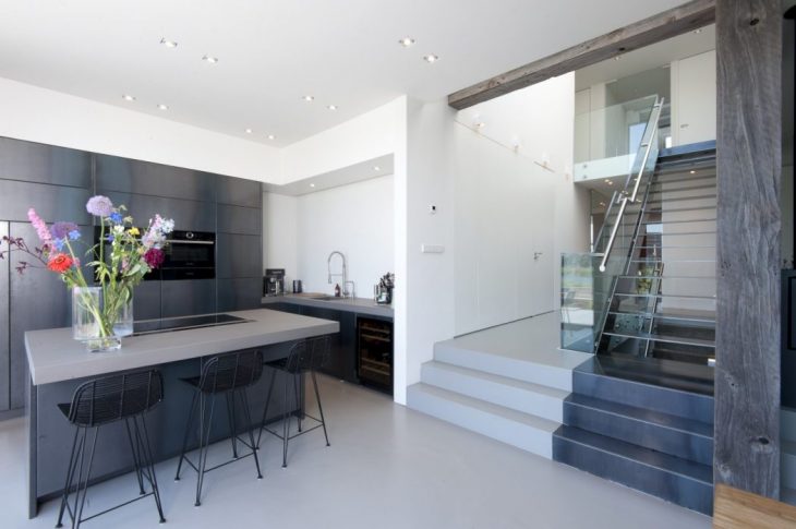 Marc Architects designed this modern two-storey residence located in Amsterdam, Netherlands,in 2016. The residence boasts 300m2 GFA and a 35m2 terrace which arised by moving the first level 3m to the south in order to have maximum sunlight into the northern gardens along the water. The main entrance and the garage are situated on the ground floor.The central heart of the house with stairs and a cosy living and working area in the front south-west corner are lifted. The dining and kitchen are on garden level. The first floor contains four bedrooms, two bathrooms and a dressing room. There’s also guesthouse in the basement, a large storage and wine section and an important and efficient space for installations. Take a look at the complete story after the jump.