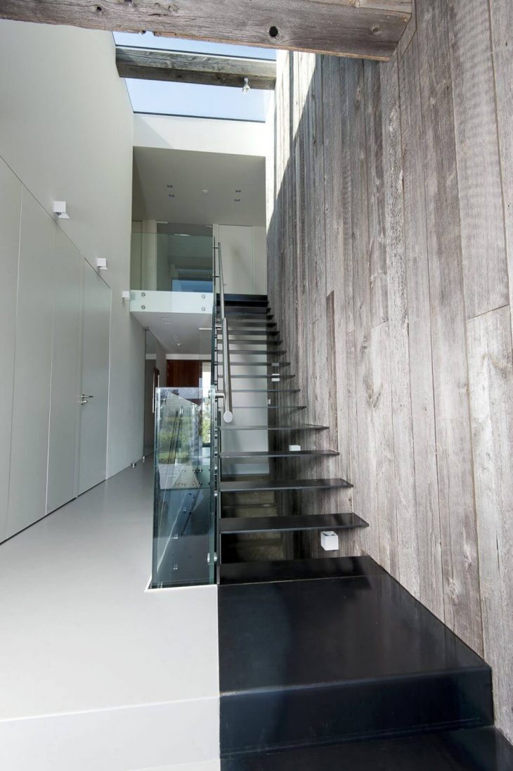 For the interior we mainly used rough materials to express the clients unpolished and imperfect inner being. Kids shout be able to play easily on floor without taking care of messing up. All floors are for this reason seamless. For the stairs and kitchen we used (untreated) steel panels. The roll patterns derived from flattening the steel plates, are symmetrically devided onto the cabinets. We used 200 year old Canadian barnwood sidings to design allmost all bathrooms furniture, sliding doors and wall coverings.