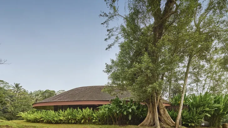 Villa Omah Prana Payangan by Alexis Dornier sits in the highlands of Payangan as a study of circular form and controlled structure. The project follows one clear idea: a ring-shaped plan that arranges every room along the perimeter. This configuration directs the entire home toward the surrounding area and establishes a consistent orientation. The living room opens toward both the courtyard and the exterior, creating a direct flow between the inner circle and the broader site. The bedrooms and other enclosed areas sit deeper within the plan as air-conditioned, private spaces that hold a quieter atmosphere.