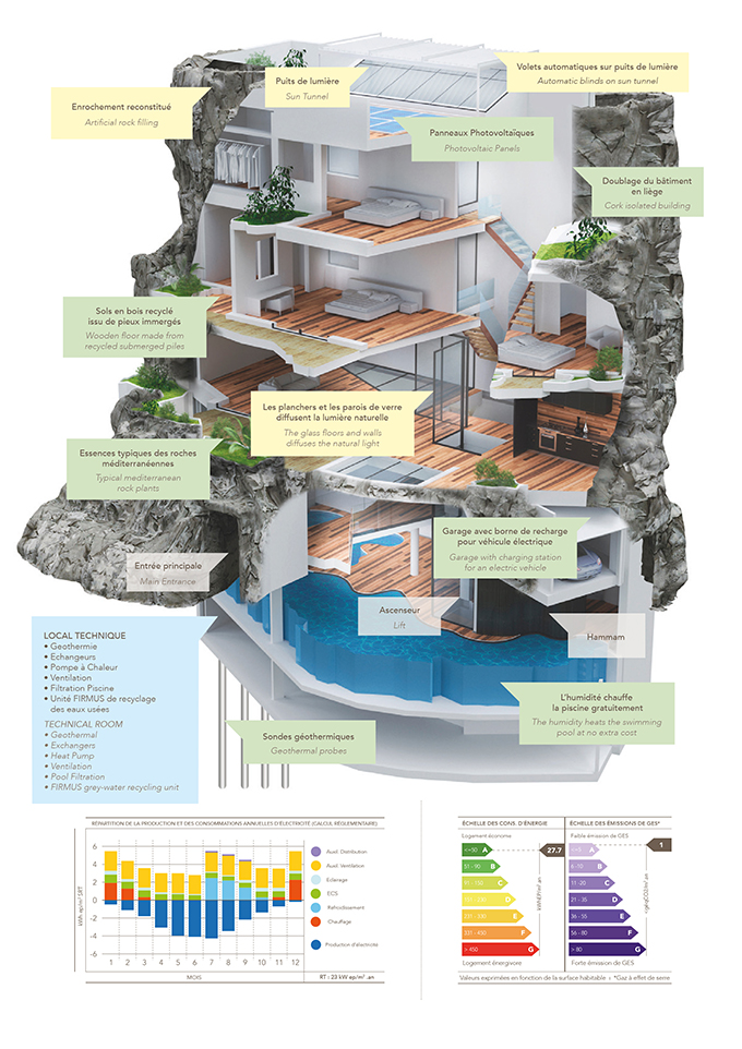 In addition to its purely architectural aspect, its design appropriates thinking about its impact while ensuring its occupants enjoy a dry and comfortable interior environment. The Villa Troglodyte’s consumption is less than 40% of the consumption of a conventional house based on the Réglementation Thermique Française (French thermal regulations). This goal is reached by means of bioclimatic architecture, by the thermal performance of the building’s skin and the search for maximum penetration of and diffusion of natural light. Reliance on renewable energies available on the site, i.e. geothermal and solar, ensures production of most of the Villas requirements.