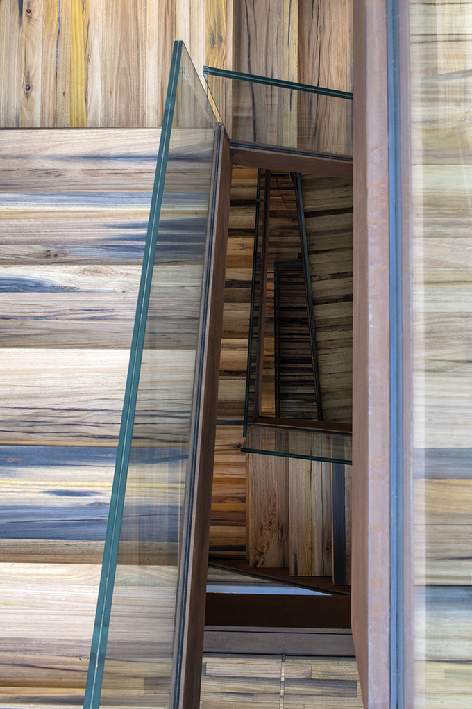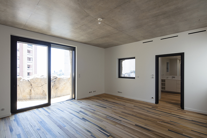 Natural materials, either recycled or from the region, were preferred. The structure is made of Low Carbon concrete and the cladding in cork from the Var department is a healthy and dry form of natural insulation also contributing sound proofing effects. The walls are clad with lime in natural pigments and the wood floors are made of recycled, emerged pilings used in mussel culture systems. Doors and staircases are made of solid wood from responsibly and sustainably managed forests.