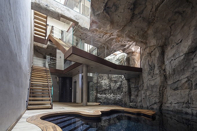 The existing rock is kept for the ground floor, whereas in the upper levels, it is recomposed with an identical texture to that of the existing rock. The designed forms along with the recreated vegetation expose the natural rock features of fractures, cavities and strength, without leaving the impression it is merely some sort of cladding of built walls.