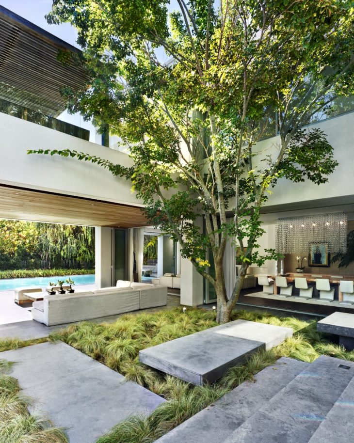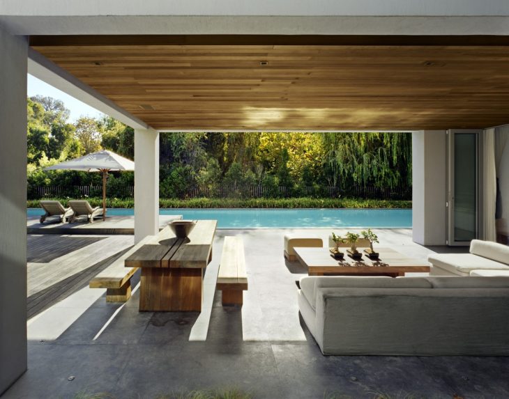 The organic edges of this centrepiece are contrasted by linear suede seating by Minotti, maintaining visual appeal through the curvature of each piece of furniture. By adding plant life indoors, the flow between inside and out is uncoerced, aided by the echoing of wood in both spaces – the living area’s dark stained oak flooring and the iroko timber tables and benches outdoors. ‘A casual holiday feeling is aroused when stepping out onto the undercover patio,’ says Mark of the area that offers alternative options for dining, entertaining and relaxing. Positioned in such a way as to fully enjoy the swimmingpool and verdant garden beyond, it’s here that one again appreciates the marriage of pronounced architecture and equally