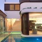 Where volumes could appear overwhelming, they have been cosied up – the slatted timber ceiling within the double-volume entrance divides the overhead space while allowing shards of light to penetrate it from the skylight above. Such shadow play continues in the dining room, where a Venetian glass lighting feature, resembling a cascading waterfall, reflects and refracts rainbows of illumination across the openplan