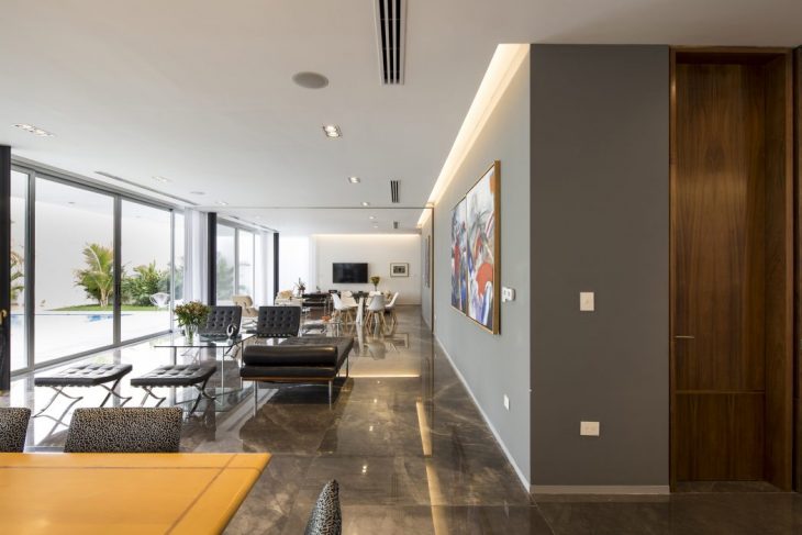 The pavements, mexican marble, reflective in manner of a continuous platform, connects all the interior spaces. The smooth finish-based plaster on exterior and Interior, a single floor and a single corridor that defines all the spaces, creates a strong relationship of outdoor-indoor, making sequences from outdoor-sun to outdoor-shadow to indoor-open to interior more closed, getting the House to handle an opening to an own outside, dominated, managing the Visuals and activities produced spaceward.