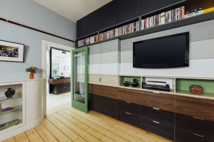 The iconic image is stretched, abstracted through horizontal bands – datums that reference the various working heights of the kitchen and bathrooms. The colours of the landscape are translated into bands of coloured tiles. The coloured tiles then reduced to timbers of tonal equivalents for the joinery components. The horizontal banding of these elements tie together the new insertions of the Kitchen, Laundry, TV Room, Bathroom, Master Robe and Ensuite within the built fabric of the existing classic Californian Bungalow, with its internal palette of rich timber panelling to the entrance foyer and dado panelling in the TV Room.
