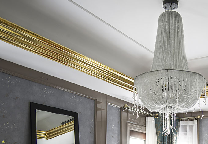 Look at the dining room from the living room, the Pop Monroe picture interacts with you wittily. Horse has always been a symbol of British aristocracy, the blue and gray horsehead sculpture together with the blue Tiffany side cabinet and hanging picture depict an ideal imagery. It is also a “prêt-à-porter” tailor-made for this space by the designers. Mirror surface is used on the wall of the small study on the 2F, it adds to the feeling of depth by reflecting views of other spaces. The concise ceiling line and gold foil shell nosing of the Gypsum line convey a sense of modern and elegant.