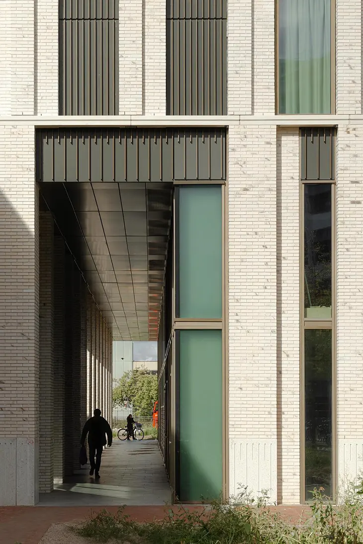 Material articulation plays a central role in the tower’s expression. Brick, concrete, aluminium, and glass are used consistently from base to top, with careful attention to detailing across the entire height. Where the building tapers, horizontal articulations introduce communal roof gardens, breaking down the scale of the tower and offering shared outdoor space at elevated levels. A pronounced diagonal serration defines the building’s profile, visually linking it to the colonnade bordering the square near the Machinekamer and guiding residents and visitors toward the main entrance.