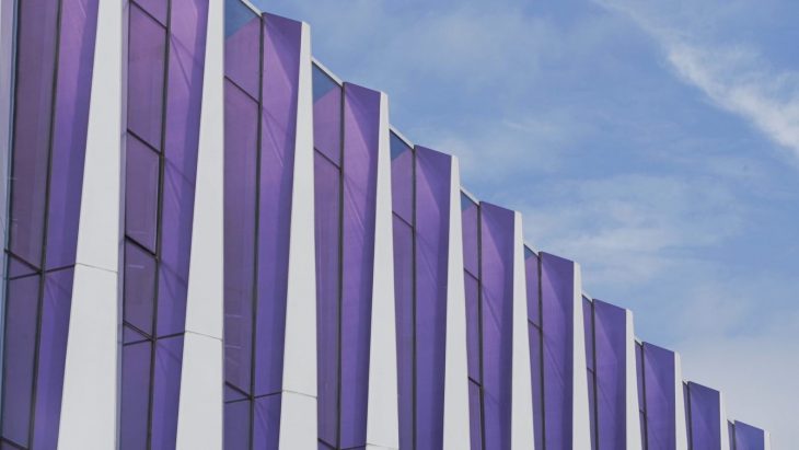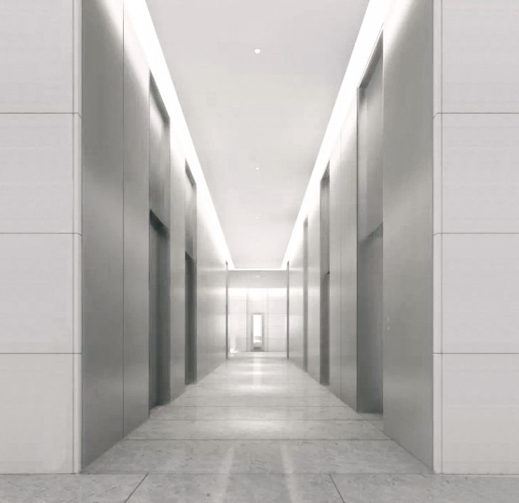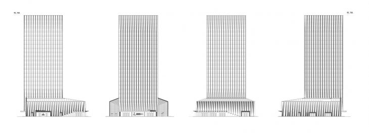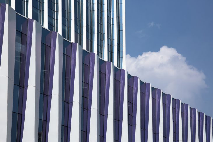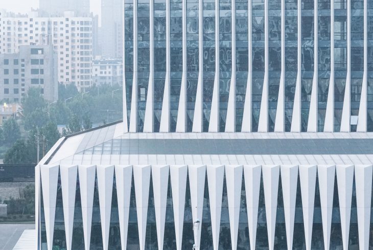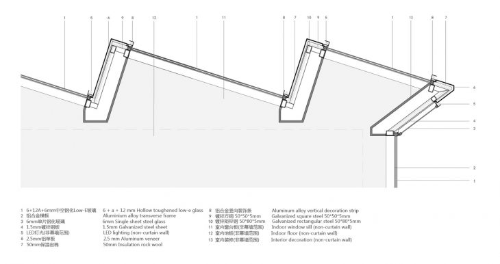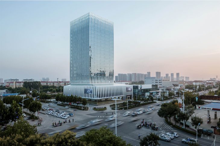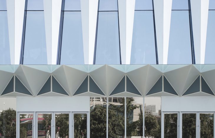 In vertical direction, components run though the whole facade. Around the top and the bottom of the tower, the facade components change from line to surface rhythmically. The detailed facade on podium plus the middle and the top of the tower, shaped the integrity of the building. Near to the ground, the facade of the podium is detailed by folded iridescence aluminum panels in geometrical form. The alternate reflections of natural light and surrounding scenes from the aluminum panels and the glasses gives the facade spatial characteristic.