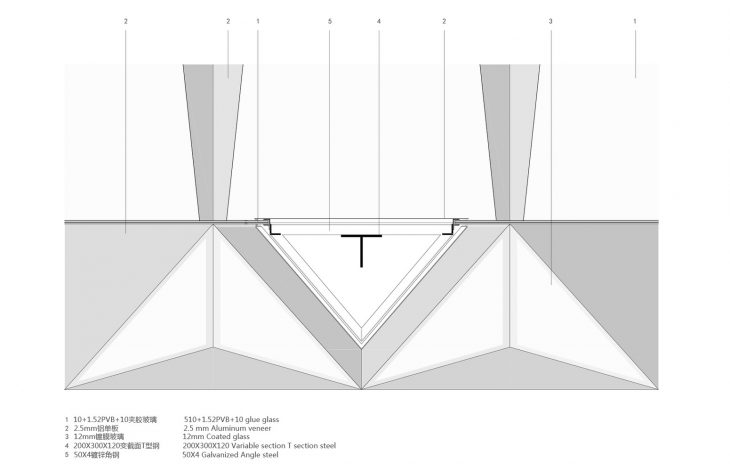 Views of the site are varied. In north and east sides, the straight line of the plan is folded up to the river in the east side, which forms triangular spaces around the margin of the building. to lead the people’s eye is looking forwards the view from Yi river. Every folding unit is 2.1-meter long. So, the scale of it is suitable for two to three persons to have rest and enjoy the awesome view around the building. The east and west sides are folded up perpendicularly to face the river and the urban respectively. Overall, it forms a condition that the fluid facade is relatively more see-through in southeast and more solid in northwest to respond its particular context.