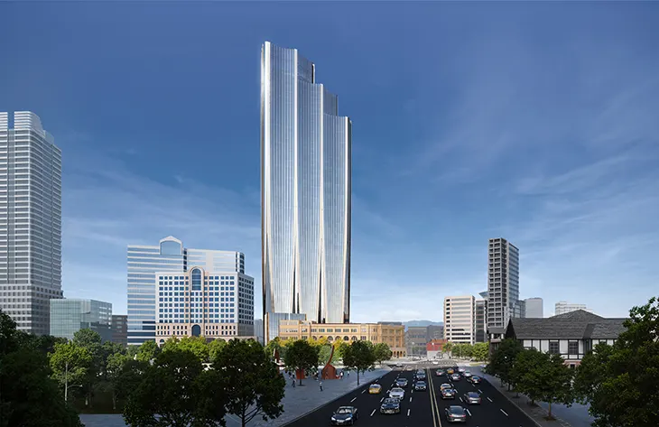 Set back from the historic post office, the 47-storey tower draws formal inspiration from the fluted geometry of Taiwan’s native Phalaenopsis orchid. The tower’s vertical articulation references the organic structure that supports the orchid’s petals and sepals, translating botanical logic into architectural expression. As the tower rises, it unfurls and extends outward, shaping a silhouette that differentiates it from Taipei’s orthogonal skyline.